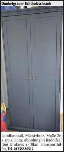 ## Dunkelgrauer Echtholzschrank im Landhausstil - **Material**: Massivholz - **Maße**: 2m x 1m x 0,6m - **Abholung**: in Radolfzell - **Transporthilfe**: im Umkreis von -10km