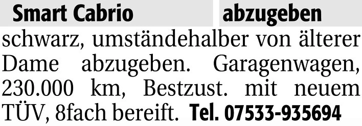 schwarz, umständehalber von älterer Dame abzugeben. Garagenwagen, 230.000 km, Bestzust. mit neuem TÜV, 8fach bereift.